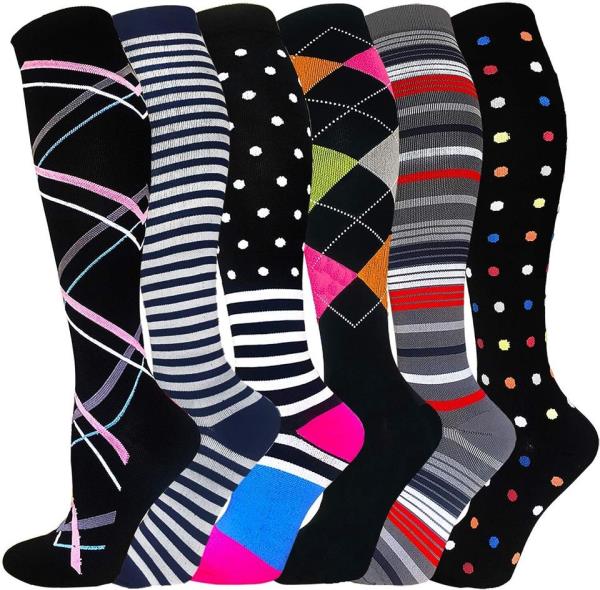 一包5只及膝高的压缩袜,看起来不像压缩袜。你再也不用在有趣的图案连衣裙袜和运动压缩袜之间做出选择了。这套五双20-30毫米汞柱的压缩袜有很多有趣的颜色和图案(以及性能风格和中性色),让你在表达自己的同时给你的脚、脚踝和小腿一些额外的支撑。它们是由含铜的吸湿排汗织物制成的,可以防止你的脚太时髦,可以在徒步旅行时穿着,也可以在旅行或长时间穿着时穿着。