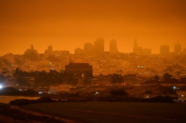2020年9月9日,由于加州野火燃烧产生的烟雾,旧金山的天际线几乎看不到。Eric Risberg,美联社图片