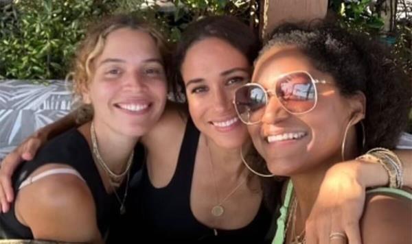 8月4日,即将年满42岁的苏塞克斯公爵夫人和她的朋友发型师卡迪·李以及作家克莱奥·韦德在一家豪华餐厅的花园里自拍。
