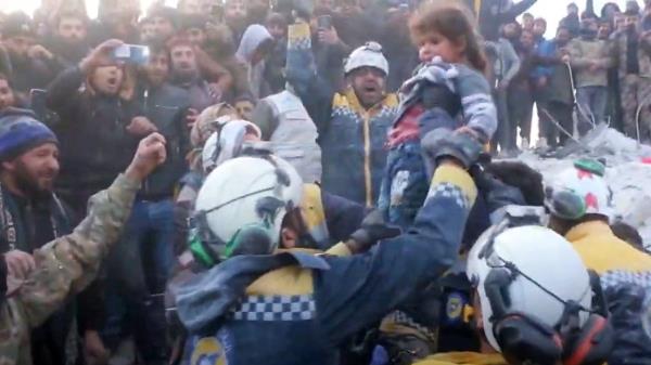 叙利亚民防组织(也被称为“白头盔”)发布的视频显示,周二下午,救援人员在叙利亚西北部伊德利卜附近的比斯尼亚村倒塌的房屋废墟中钻探。当一名男子被担架抬到救护车上时,他举起手指,救援现场周围的一大群人爆发出欢呼声。