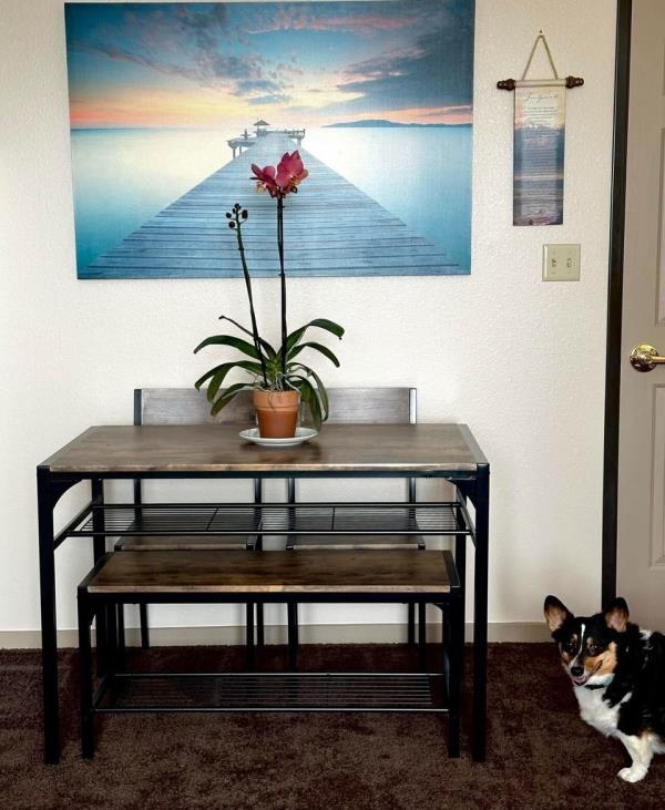 一张餐桌,椅子和长凳有三种装饰可供选择。