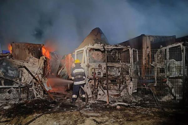 据报道,爆炸破坏了一个仓库,烧毁了数十辆卡车,两名司机受伤。