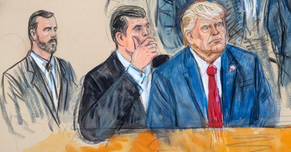 This artist sketch depicts former President Do<em></em>nald Trump, right, co<em></em>nferring with defense lawyer Todd Blanche, center, during his appearance at the Federal Courthouse in Washington, on Aug. 3, 2023.