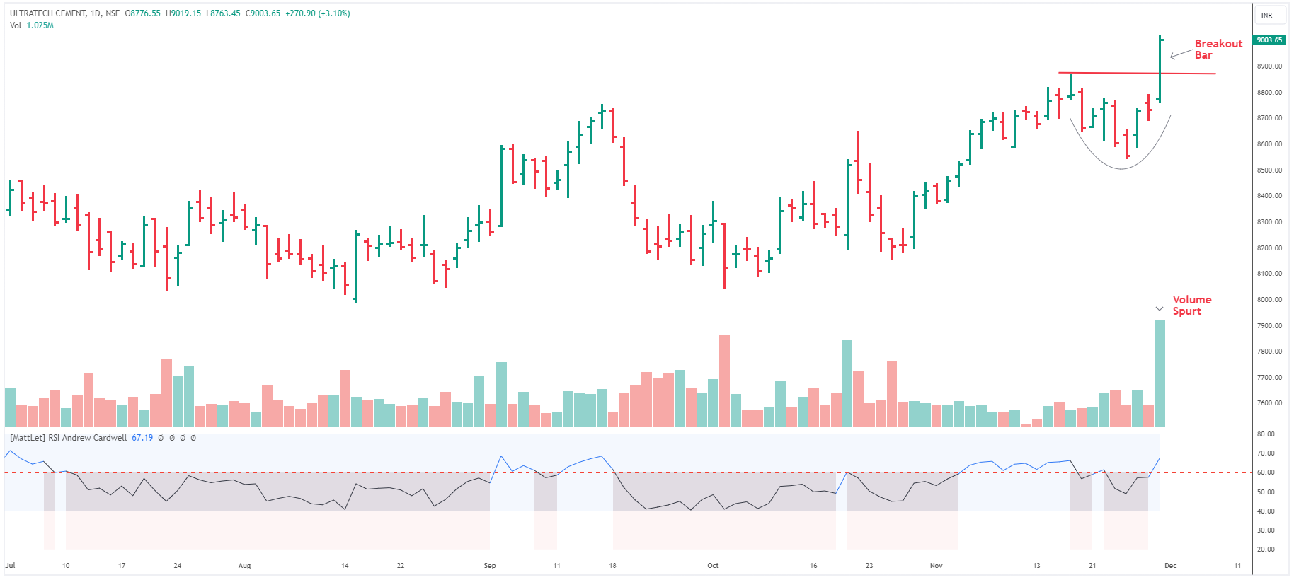 周四,UltraTech Cement的股票在每日规模上突破了8天的盘整模式。这一突破受到了超过50日平均成交量3倍的强劲成交量以及市场参与者强劲的买入兴趣的支撑。50天平均成交量为31.2万卢比,而周四该股的总成交量为102.5万卢比。此外,该股在突破日形成了一个相当大的看涨蜡烛,这增加了突破的力量。