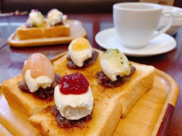 这是2022年6月1日在名古屋中村区“Kako”咖啡店柳木桥分店的面包,上面撒着甜豆沙、果酱和鲜奶油。(每日/ Hiroshi小泉)