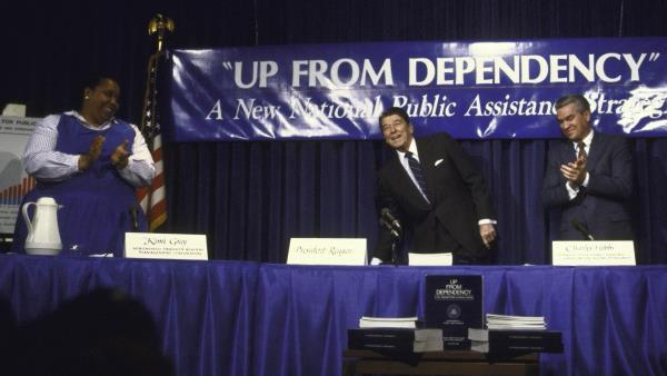 在那一年的国情咨文演讲中,里根甚至把政府服务比作毒品。他说,他想帮助穷人“摆脱依赖的蜘蛛网”,并认为福利项目“降低了工作的道德价值,鼓励家庭破裂,使整个社区陷入凄凉无情的依赖状态”。