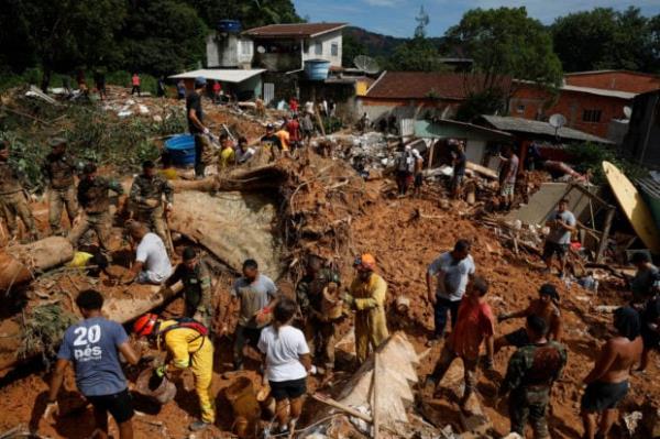 2023年2月21日,在巴西圣塞巴斯蒂安Barra do Sahy地区,志愿者和消防员在强降雨后的一处山体滑坡现场寻找遇难者。路透/阿曼达Perobelli