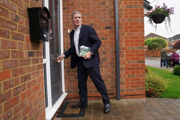 工党领袖凯尔·斯塔默爵士在贝德福德郡的信箱里散发传单,他期待着该党在塞尔比和安斯蒂的补选中获胜后的下一个选举胜利。