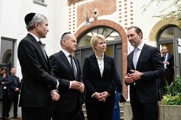 德国总理奥拉夫·肖尔茨(Olaf Scholz)和德国主要的犹太领袖约瑟夫·舒斯特(Josef Schuster)在柏林一座犹太教堂举行的周年纪念仪式上发表讲话。去年10月,这座犹太教堂遭到燃烧弹袭击。