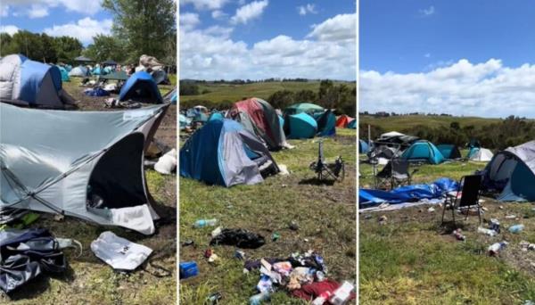 新西兰广播公司收到的视频显示,今年的北鲈鱼节结束后,留下了数十顶帐篷,有些已经破损,上面覆盖着泥土。