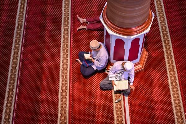 穆斯林斋月期间,男人们在祈祷后阅读《古兰经》2024年3月12日,班达亚齐的Al Makmur清真寺。(图片来源:CHAIDEER MAHYUDDIN /法新社)
