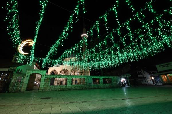 这张照片拍摄于2024年3月11日,展示了圣月的第一个晚上,萨拉热窝历史中心巴斯卡尔西亚一座清真寺前的广场上的灯光装饰斋月之初。(图片来源:埃尔维斯·巴鲁克cic /法新社)