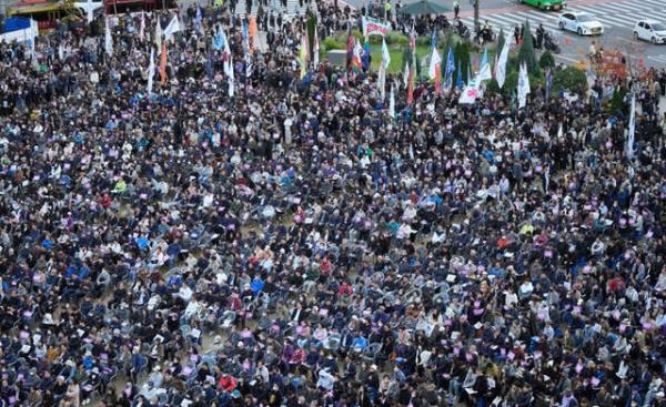 这群人游行穿过首尔,然后到达一个广场参加追悼会,追悼会吸引了数千人。