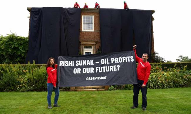 绿色和平组织将Rishi Sunak空无一人的家铺上黑色布料,以示对石油开采的抗议,这已经不是绿色和平组织第一次将矛头对准高级政治家的家了。