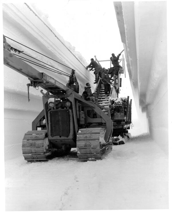 地点确定后,数百名军事工程师和技术人员从格陵兰西北海岸现有的图勒空军基地长途跋涉150英里来到世纪营所在地。从1959年到1961年,他们在密实的雪地里挖了几百英尺,建造了一个地下城市,里面有卧室、实验室、办公室、理发店、洗衣房、图书馆和供200名士兵使用的温水淋浴间。